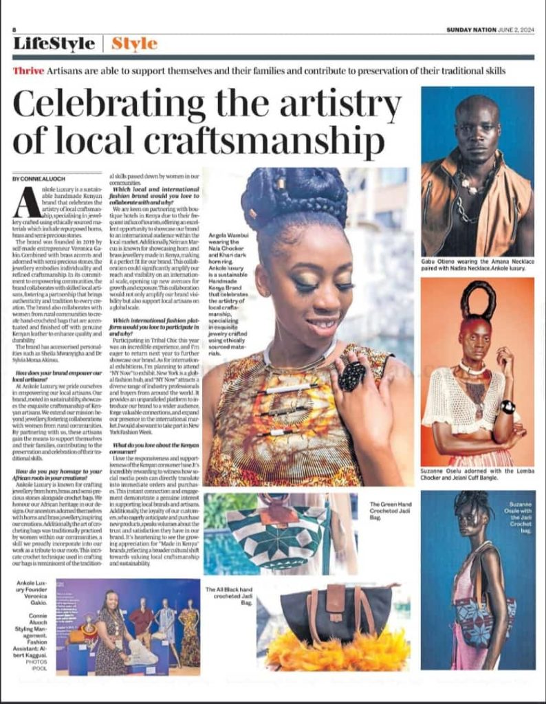 all skills passed down by women in our communities. Which local and international fashion brand would you love to collaborate with and why? We are keen on partnering with bou-tique hotels in Kenya due to their fre-quent influx of tourists,offering an excel-lent opportunity to showcase our brand to an international audience within the local mariceL Additionally Neiman Mar-cus is known for showcasing horn and brass jewellery made in Kenya, making it a perfect fit for our brand. This collab-oration could significantly amplify our reach and visibility on an internation-al scale, opening up new avenues for growth and aposure.This collaboration would not only amplify our brand visi-bility but also support local artisans on a global scale.